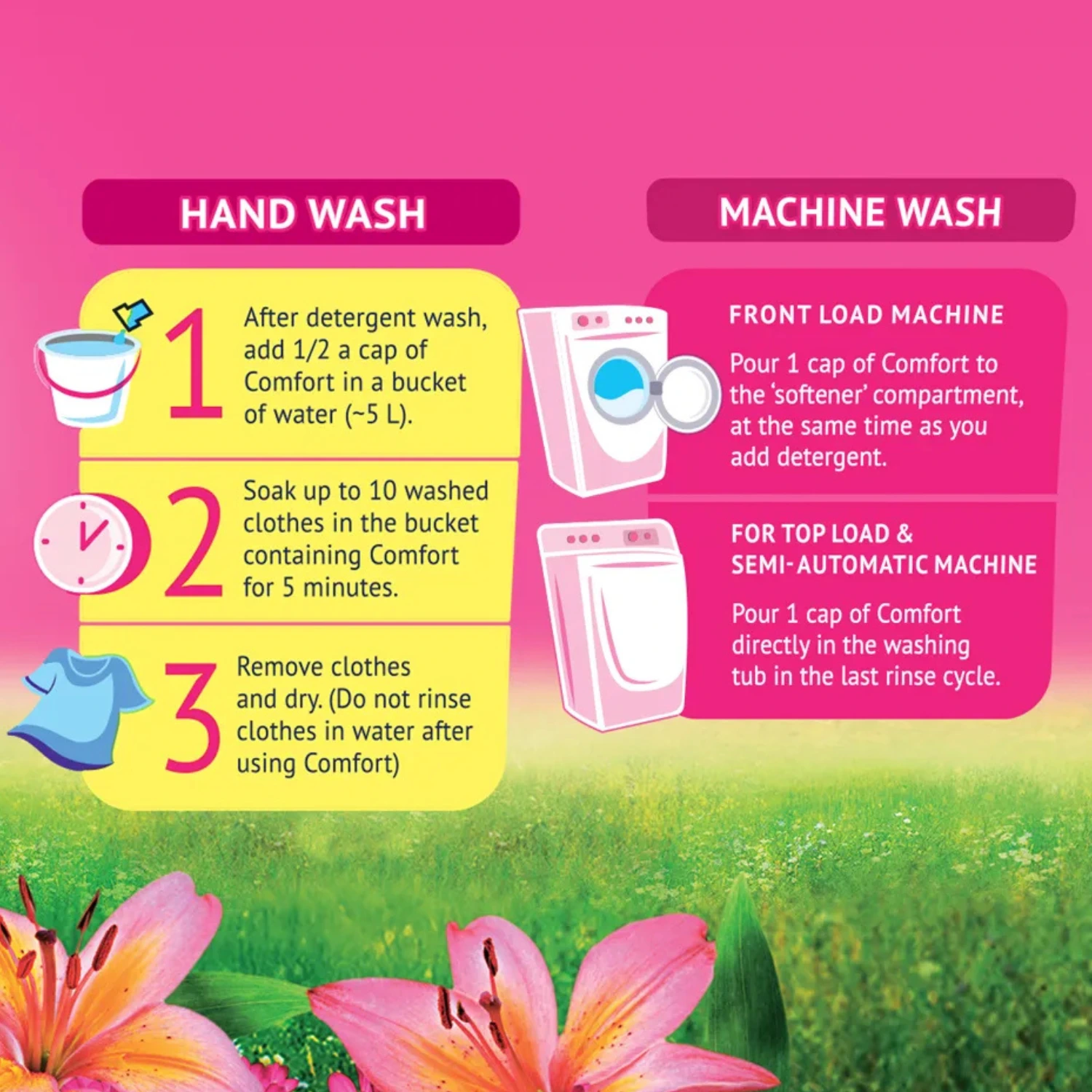 After detergent wash, add half a cap of Comfort in a bucket of water 5L.